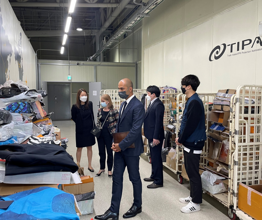 4월 27일 Louis Vuitton 파리 본사의 글로벌 지식재산권 부문 책임자(Valérie Sonnier,General Counsel Global IP Department 좌로부터 두번째)와 아시아태평양지사 지식재산권 부문 책임자(Mayank Vaid, IP Director Asia Pacific & China 좌로부터 세번째)가 인천공항 국제우편물류센터 내 TIPA 상설감정장을 둘러보고 있다.