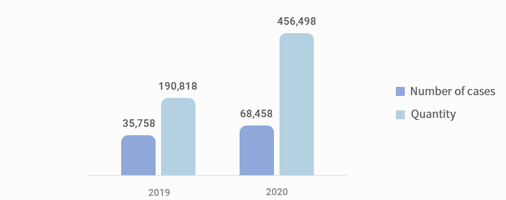 - In the year of 2020, approximately 47,000 cases and approximately 220,000 infringing items were inspected.